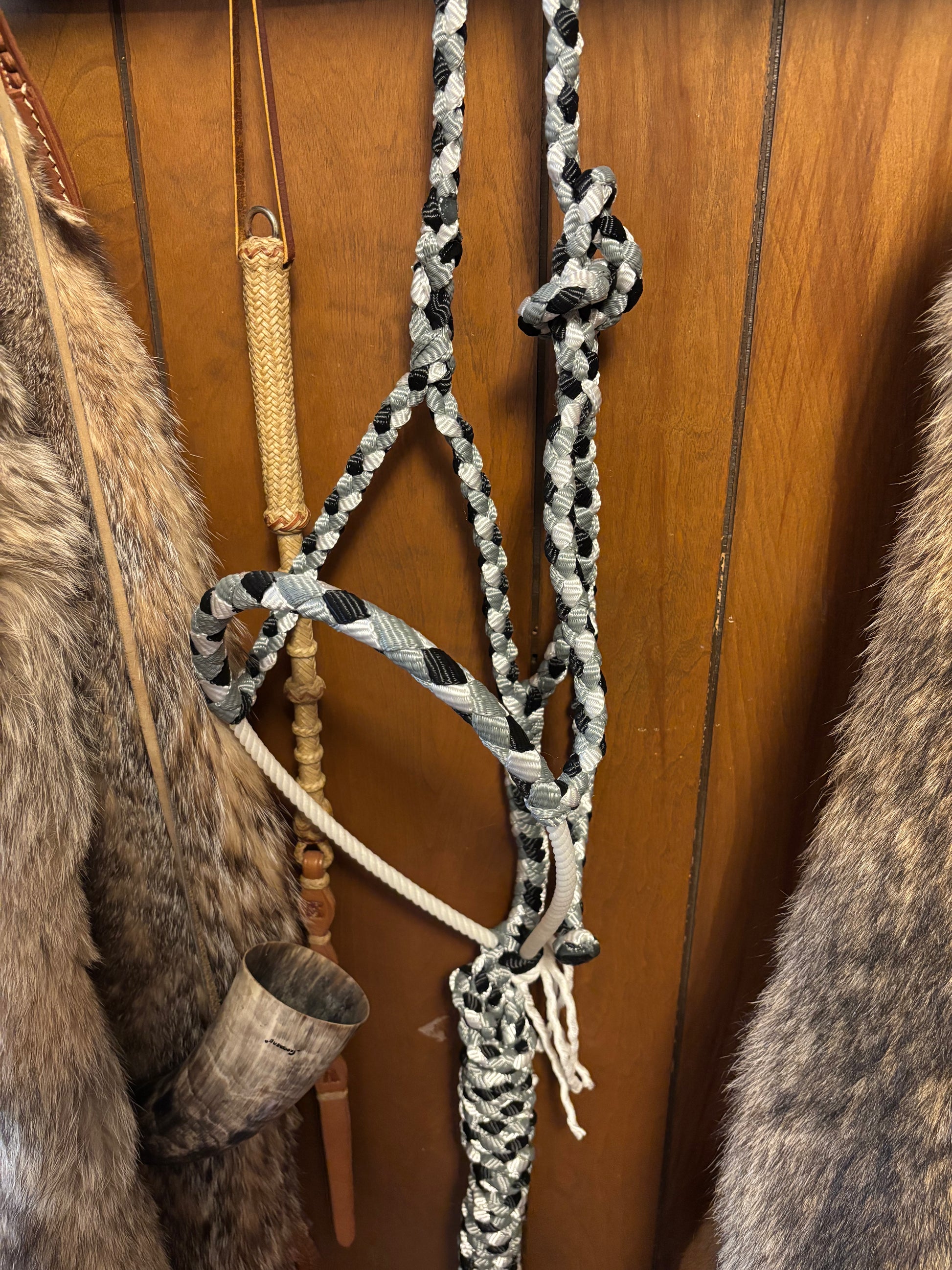 Gray, black, and white rope halter that comes with a 9 ft lead rope